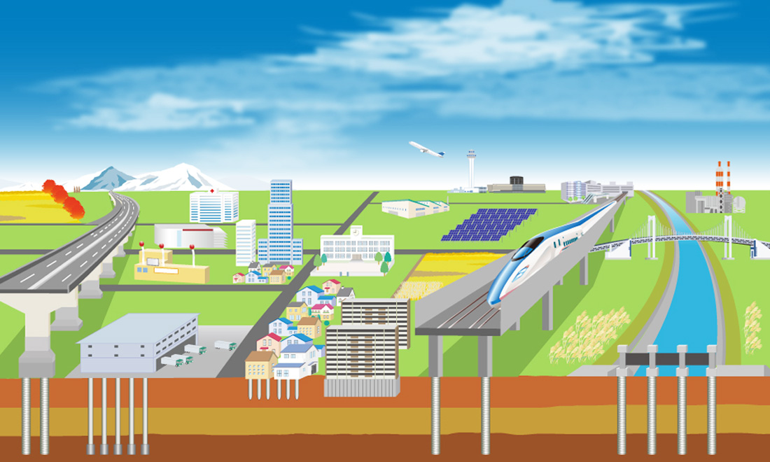 現在は、災害に強い国土造りに寄与すべく、また環境問題を意識して、「液状化対策」「耐震・免震構造物向け高支持力」「建設残土低減」といったテーマで技術開発に取り組んでいます。