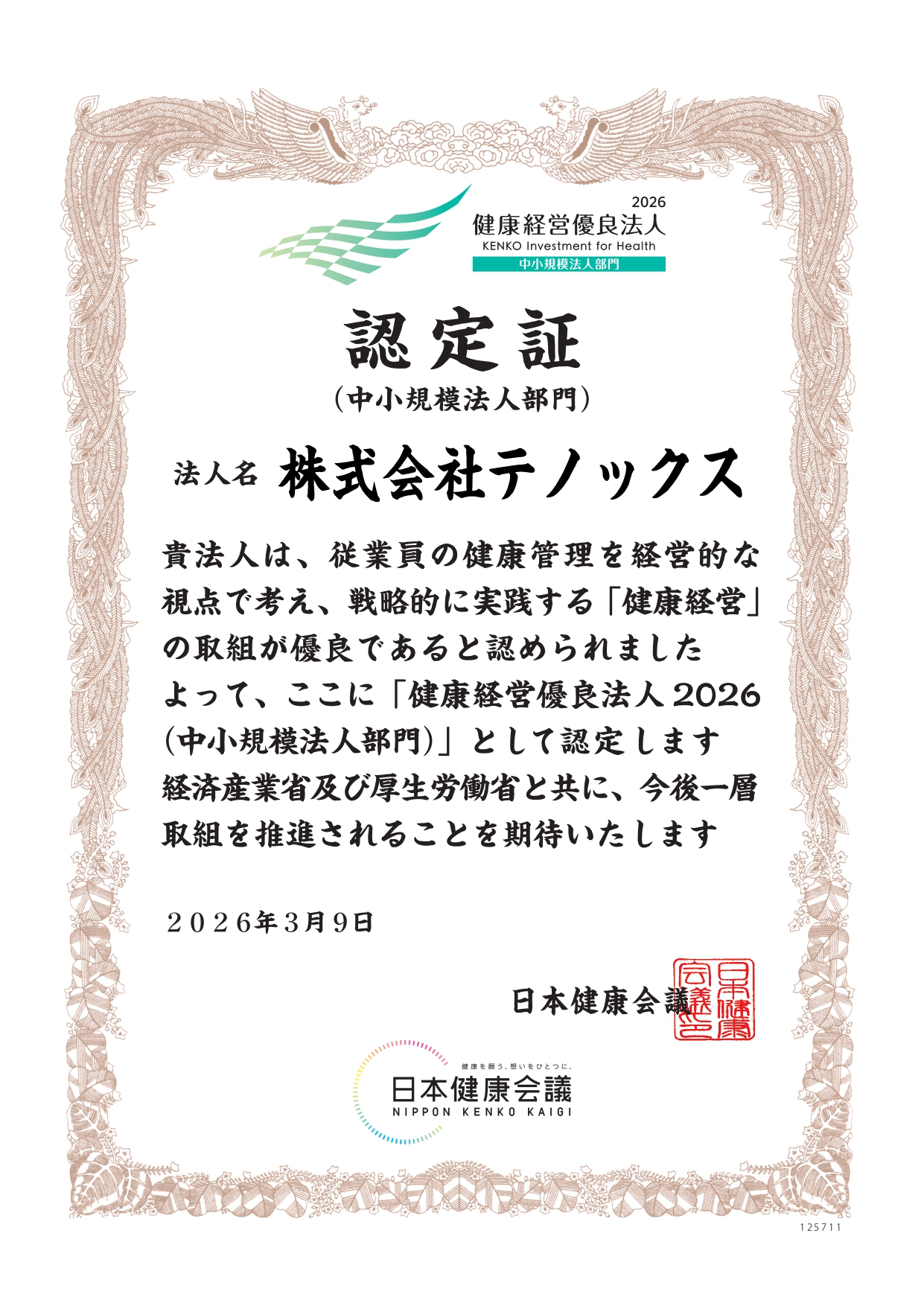 株式会社テノックスは、経済産業省と日本健康会議より、「健康経営優良法人2026」に認定されました。