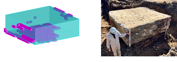 三次元出来形計測結果(左図)と築造地盤改良体出来形(右写真)の比較